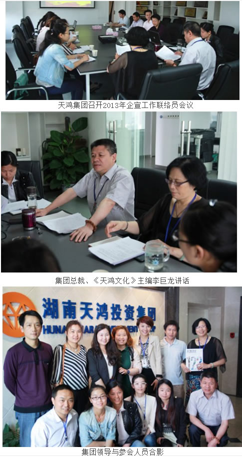 5月17日上午,天鴻集團2013年企宣工作聯(lián)絡(luò )員會(huì )議在集團公司會(huì )議室順利召開(kāi)。集團總裁、《天鴻文化》主編李巨龍,總裁助理肖翛,黨委副書(shū)記、聯(lián)合工會(huì )主席廖蘭芳等領(lǐng)導以及集團各分子公司行政負責人和聯(lián)絡(luò )員參加了會(huì )議。